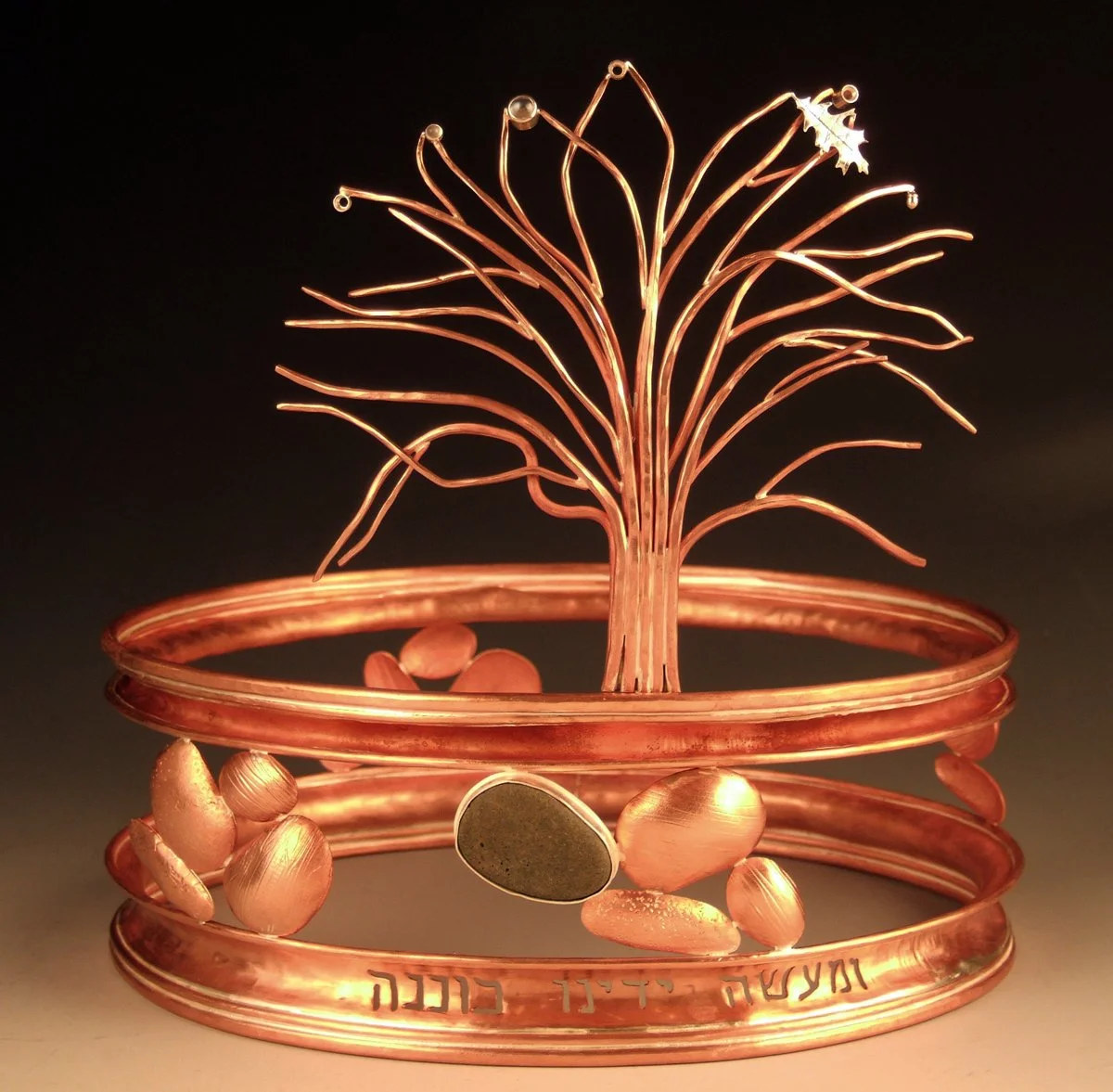This Torah crown was commissioned by Rabbi Daniel Fink in the memory of his father, Rabbi Arnold Fink z”l, for Congregation Ahavath Beth Israel in Boise, Idaho. The numbers 7, 18, and 36 are repeatedly used in the many parts that make up this Keter Torah. These numbers have several significant meanings within Judaism, for example, seven is the day of the Sabbath and 18 in Hebrew is “chai” the word for life. Seven oak trees ring the top of the Keter Torah. The oak trees reflect the woods behind Rabbi Fink’s childhood home, where he and his father would often walk. There are 18 oak leaves, 18 acorns, and 18-3mm moonstones, 18-4mm moonstones, and 7 larger moonstones. One ruby and one emerald sit in the trees represent life – both flora and fauna. Twelve river rocks collected from the creek, Turkeycock Run, which runs through the same forest in Alexandria, Virginia, where Rabbi Fink walked with his father. Twenty-three silver river rocks, and one river rock from Boise, Idaho, for a total of 36 river rocks, flow in between the two bands. One opal sits among the river rocks. The top band has Proverbs 3:18, Etz Chaim – Tree of Life, pierced into it. The bottom band has Rabbi Arnold Fink’s (z”l) favorite psalm - Psalm 90 pierced into it: "The work of our hands—establish it, O God. Yea, the work of our hands, may You establish it." Completed 2014. Made of sterling silver, river rocks from Alexandria, Virginia and Boise, Idaho, opal, moonstones, ruby, emerald. Size 9” x 7 ¾” x 8”. Photographed by Doug Yaple